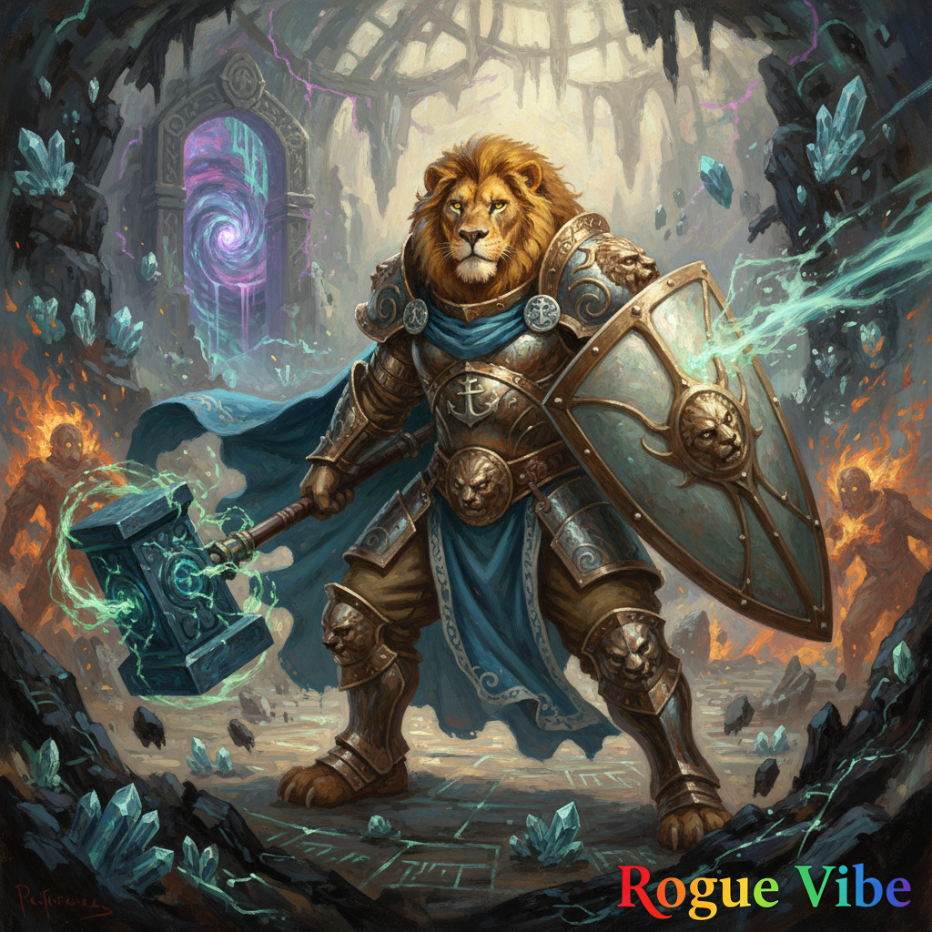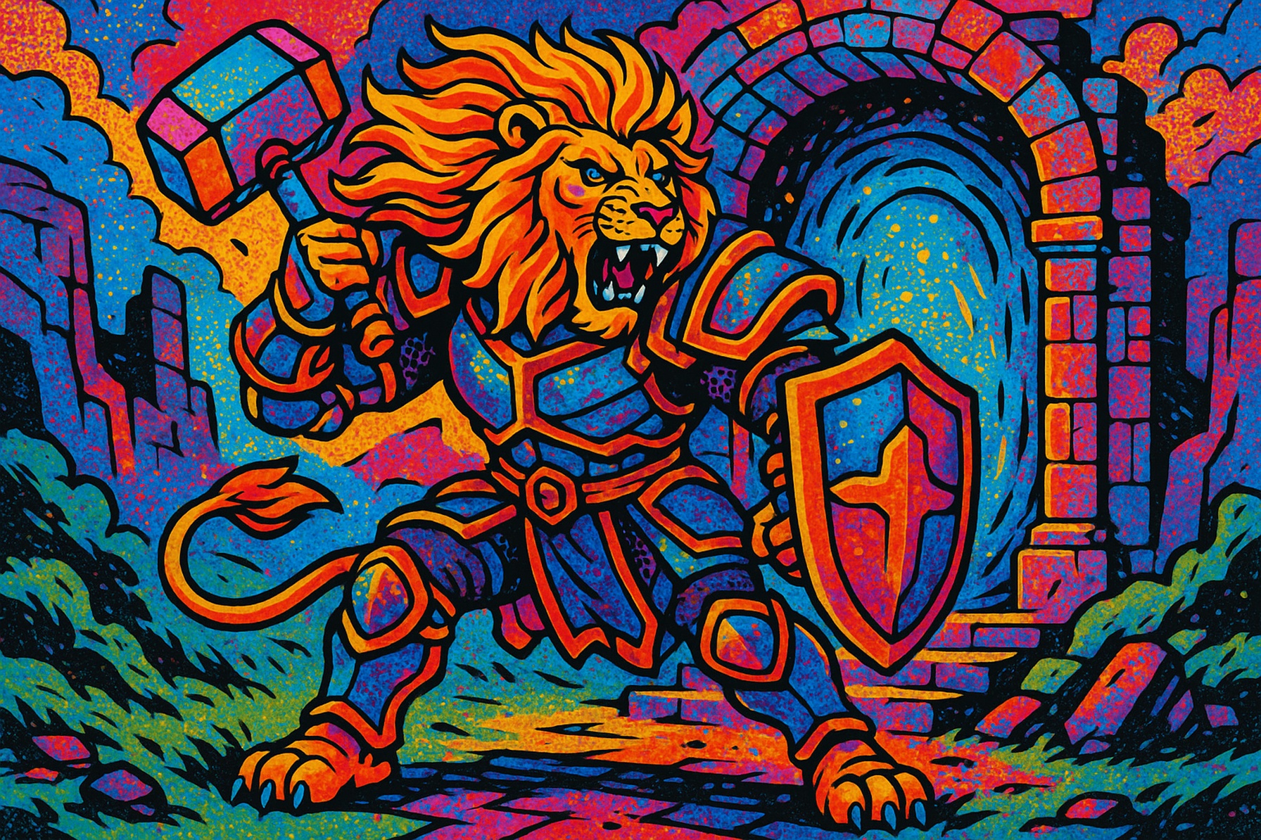 In a realm beyond mortal comprehension, there stood Lionheart the Valiant, a majestic lion clad in intricate armor, wielding a massive hammer and shield. His mane flowed like the golden rays of a Colorado sunrise, a symbol of unwavering strength and leadership. Behind him, a mysterious portal shimmered within ancient ruins, glowing with ethereal crystal light. Lionheart hailed from the mystical plane of Aetheria, where beings were as formidable as the mountains that mirror the Colorado Rockies. His era was one of myth and legend where courage and compassion were paramount. In his youth, Lionheart was known to share a remarkable bond with a young, enchanted forest. Protecting it from dark forces, he was generous with his time, always prioritizing the forest's creatures over his desires. This act of generosity bestowed upon him powerful blessings, granting him the strength of ten warriors and the wisdom of ages. Yet even the valiant face trials. Embracing his role as a protector, Lionheart chose sacrifice over self-ambition. He sealed away an ancient evil behind the dazzling portal, knowing he could never return. His fate was a legend, a story shared around campfires under the expansive skies. From an Australian perspective, his tale might be seen as one of immense bravery and mateship—selflessness admired within their culture. Yet, it might also be a cautionary reminder of the cost of giving too much, a balance crucial in life's grand adventure.