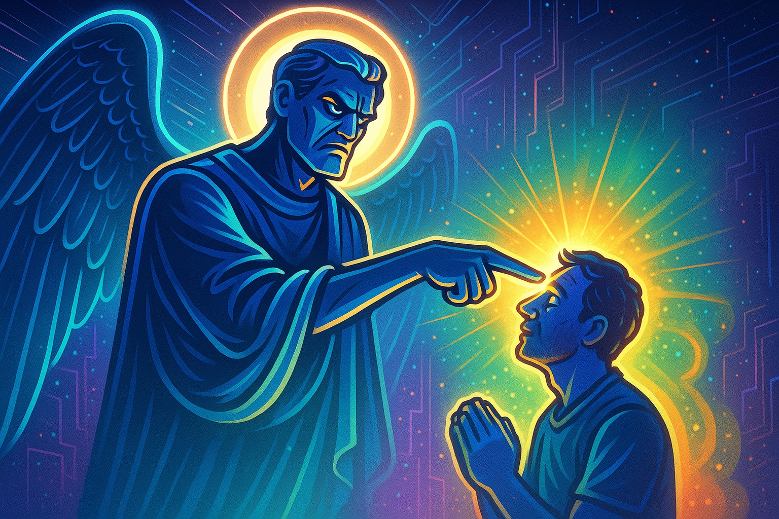 tl;drThe image is an illustration depicting Donald Trump in a messianic role, with elements suggesting nationalism and divine power.