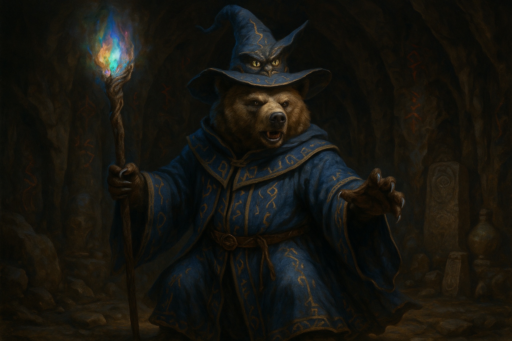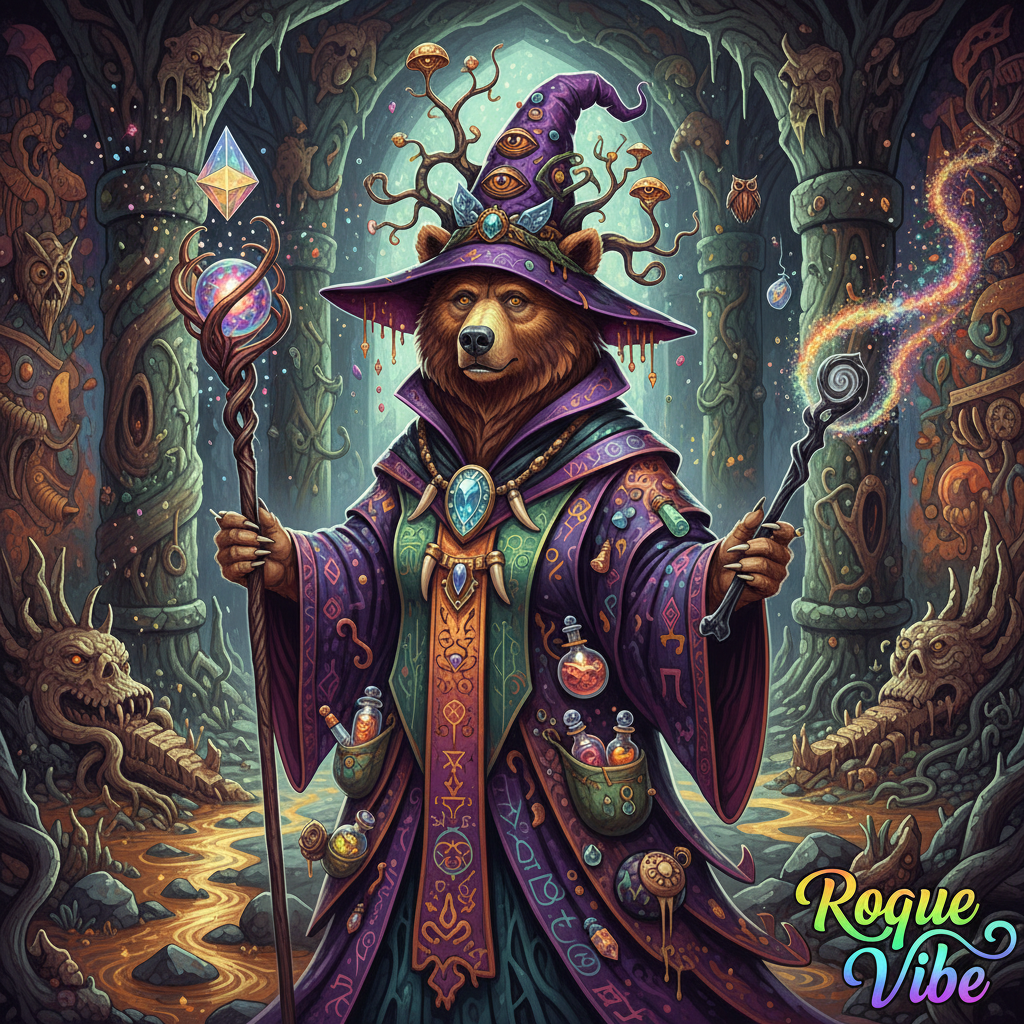 In the depths of a cavern adorned with eldritch symbols and mysterious relics stands a bear donning the robe of a wizard. The vibrant regalia is embroidered with arcane runes, and atop the bear's head is a hat that almost feels alive, its eyes gleaming with ancient wisdom. A staff glows with prismatic energy, hinting at untold power. This is Ursa the Enchanter, a figure from the mystical realm of Elaris. Known for his unparalleled mastery of enchantments, Ursa's journey began in the ancient woods, where he learned the secrets of the natural elements and the balance they maintained. A crucial moment in Ursa's life came when he discovered a hidden grove pulsating with forbidden magic. In accordance with the honesty taught by the bear elders, he confessed his discovery to the council, resisting the temptation to horde the power for personal gain. This act of integrity unwittingly unleashed a chain of events, as the grove's power was needed to avert a catastrophic imbalance threatening Elaris. Though his transparency saved the realm, it sealed his fate. Tied to the very magic he revealed, Ursa became the eternal guardian of the grove. An Australian, with their pragmatic view, might admire his sacrifice, seeing it as a testament to selflessness and communal spirit. Ursa's honesty, while binding him, preserved his world, echoing the Japanese concept of makoto, or sincerity, where truth is both a virtue and a burden, harmonizing one's existence with the universe.
